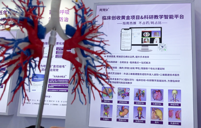 智能诊断、手术导航、医疗机器人等“AI+医疗”成果成为本届展会的焦点。梵晨博生联合中科院软件所自主研发的“阿梵D三维重建医学图像处理软件”,支持胸外、肝胆、泌尿、心脏、妇瘤、胃肠、骨科、甲乳等多科室高精度三维重建,通过病例统计,平均为单台手术节约30-50分钟时间,并已参与西班牙、泰国等国际复杂手术案例。该系统已获国家二类医疗器械注册认证,从根本上杜绝了版权不确定性及海外代理衍生风险,引发观众的强烈兴趣。