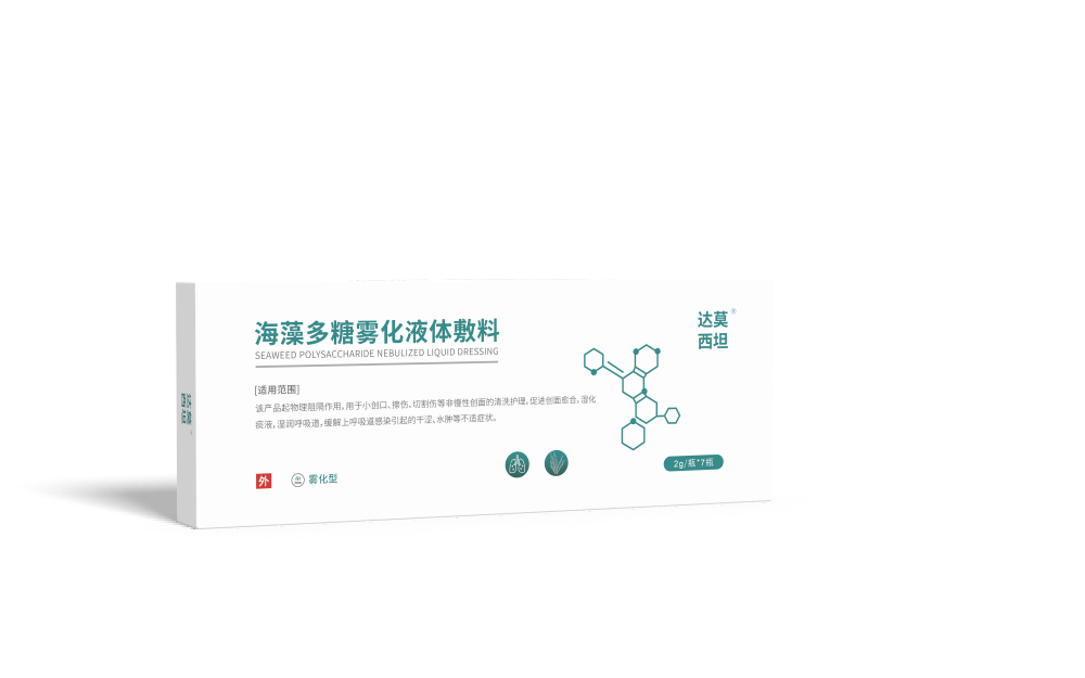 达莫西坦为广西博生生物科技有限公司旗下品牌,主营产品名为海藻多糖雾化液体敷料,注册证号桂械注准20252140226,经国家药监局批准的使用范围描述为:该产品起物理阻隔作用,用于小创口、擦伤、切割伤等非慢性创面的清洗护理,促进创面愈合,湿化痰液,湿润呼吸道,缓解上呼吸道感染引起的干涩、水肿等不适症状。是目前呼吸雾化领域内的“绿色版-雾化液”,替代已集采的品种。广泛应用于呼吸科、儿科、ICU、麻醉等。